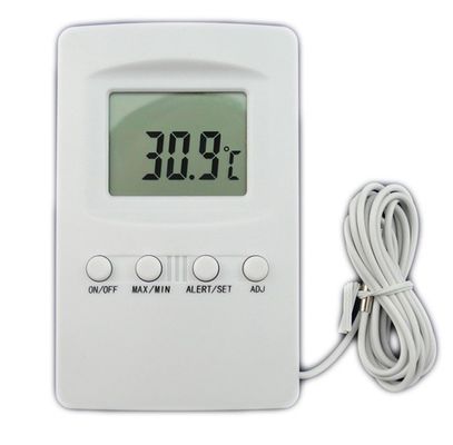 Display LCD, rango de temperatura de medición. La alarma de alta y baja temperatura puede ser preestablecida. Se puede colocar en la mesa, también se puede montar en la pared.