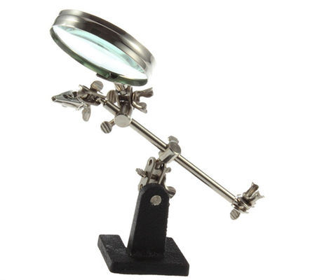 Este dispositivo de aumento económico y práctico con 3 asas es adecuado para trabajos de soldadura o para electrónica y fabricación de modelos.Con vidrio de aumentoCuenta con una lupa de 2,5x de 6 cm de diámetro en un marco de acero con una base de hierro fundido pesado.